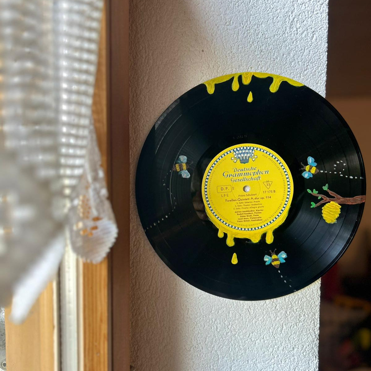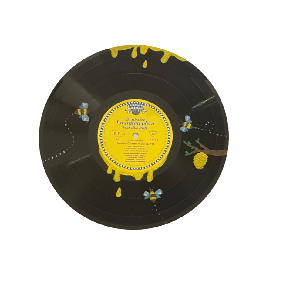 Diese einzigartige Schallplatte wurde mit Acrylfarben von Hand bemalt und zeigt verspielte Honigtropfen, die vom Rand der Platte fließen, begleitet von kleinen Bienen und einem Bienenstock am Ast. Jedes Design wird von Hand bemalt – dadurch entsteht ein unverwechselbares Unikat mit kleinen Variationen.