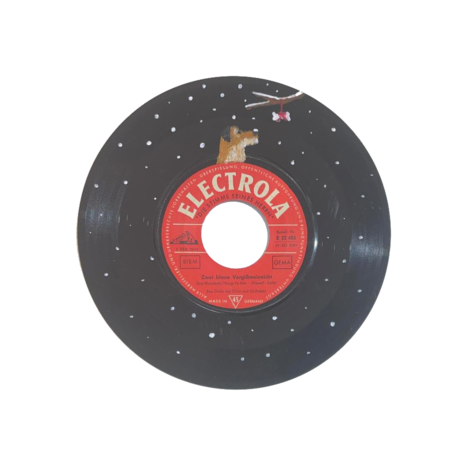 Diese handbemalte Vinyl-Schallplatte zeigt einen niedlichen Hund in einer verschneiten Winterlandschaft, der neugierig einen Knochen betrachtet, der am Weihnachtsbaum hängt. Mit viel Liebe zum Detail wurde jede Platte von Hand mit Acrylfarben bemalt – so entsteht ein einzigartiges Unikat mit individuellem Charakter.
